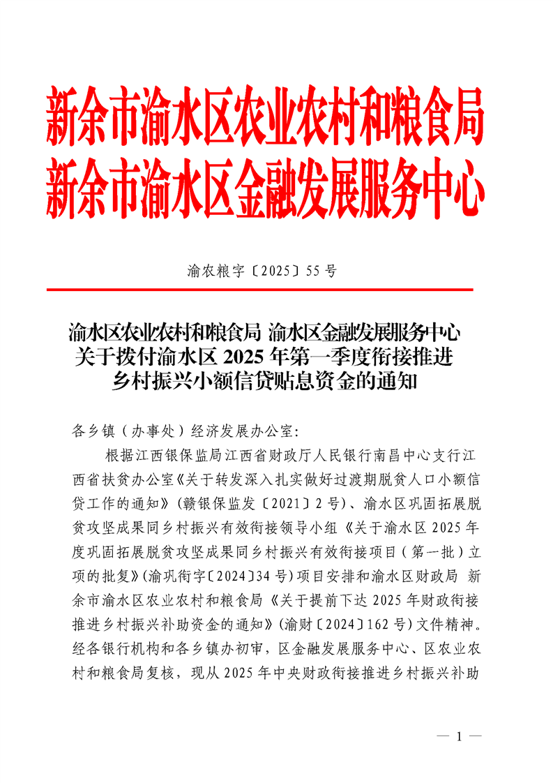 渝水區農業農村和糧食局 渝水區金融發展服務中心關于撥付渝水區2025年第一季度銜接推進鄉村振興小額信貸貼息資金的通知