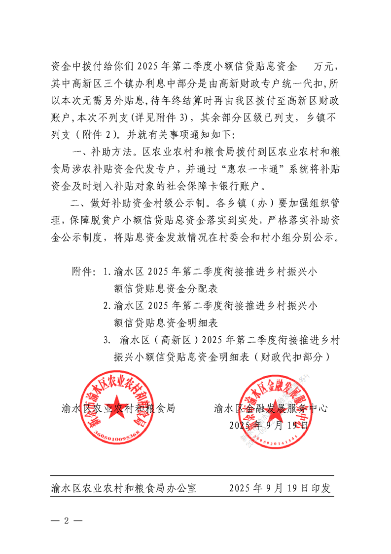 渝水區農業農村和糧食局 渝水區金融發展服務中心關于撥付渝水區2025年第二季度銜接推進鄉村振興小額信貸貼息資金的通知