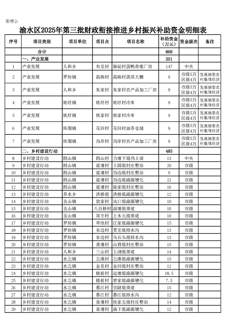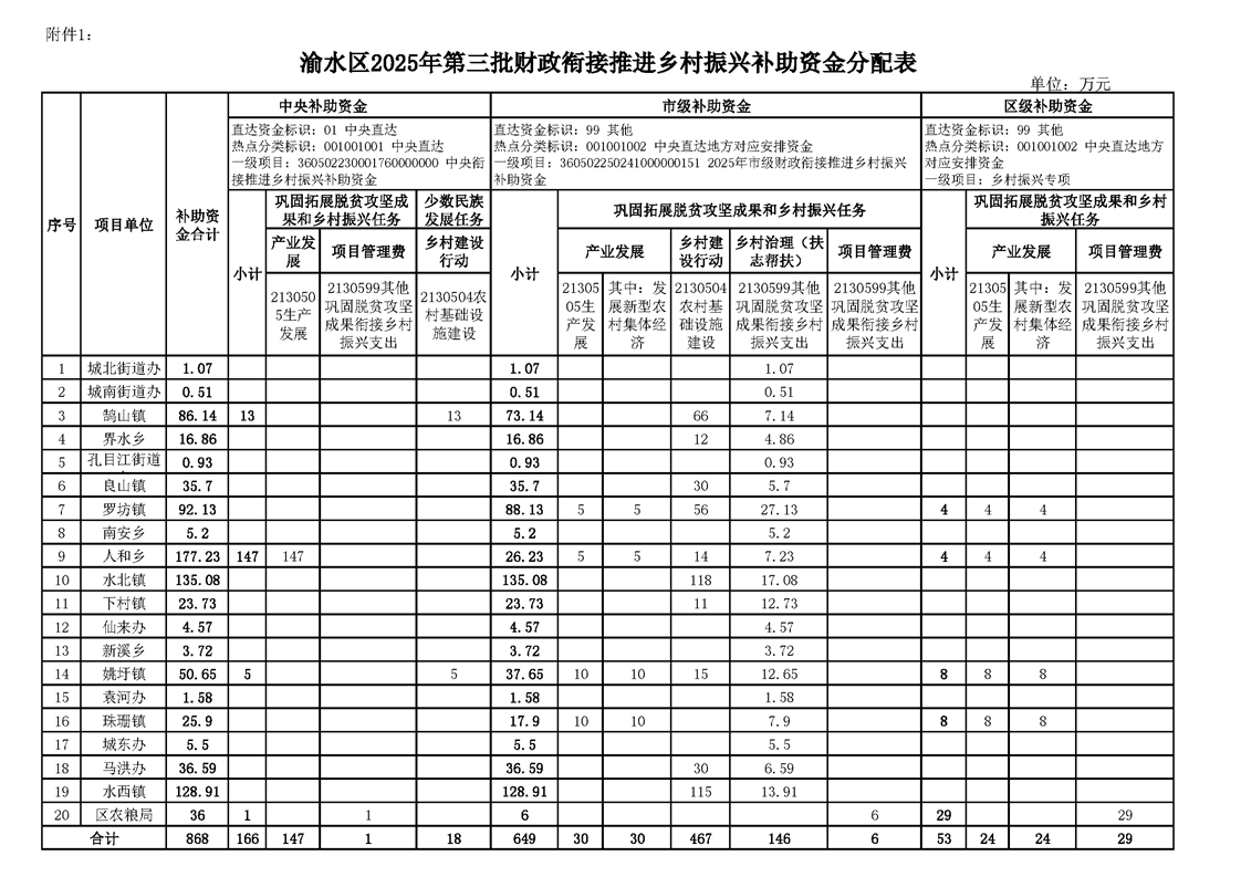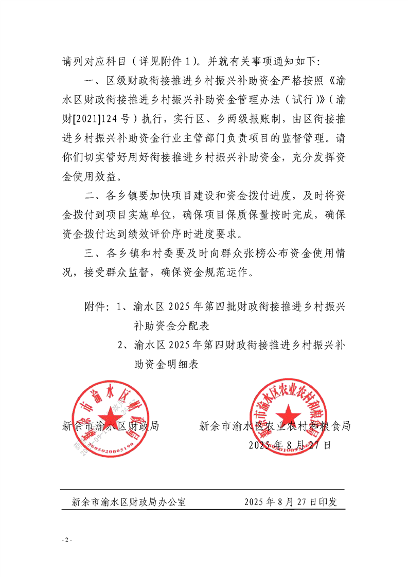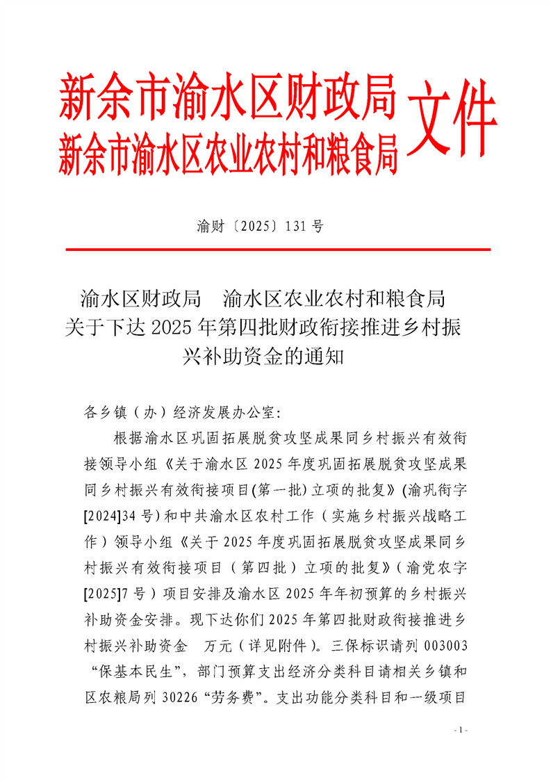 渝水區2025年第四批財政銜接推進鄉村振興補助資金分配計劃
