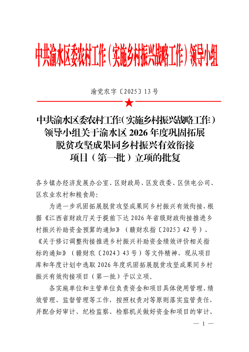中共渝水區委農村工作(實施鄉村振興戰略工作)領導小組關于渝水區2026年度鞏固拓展脫貧攻堅成果同鄉村振興有效銜接項目(第一批)立項的批復