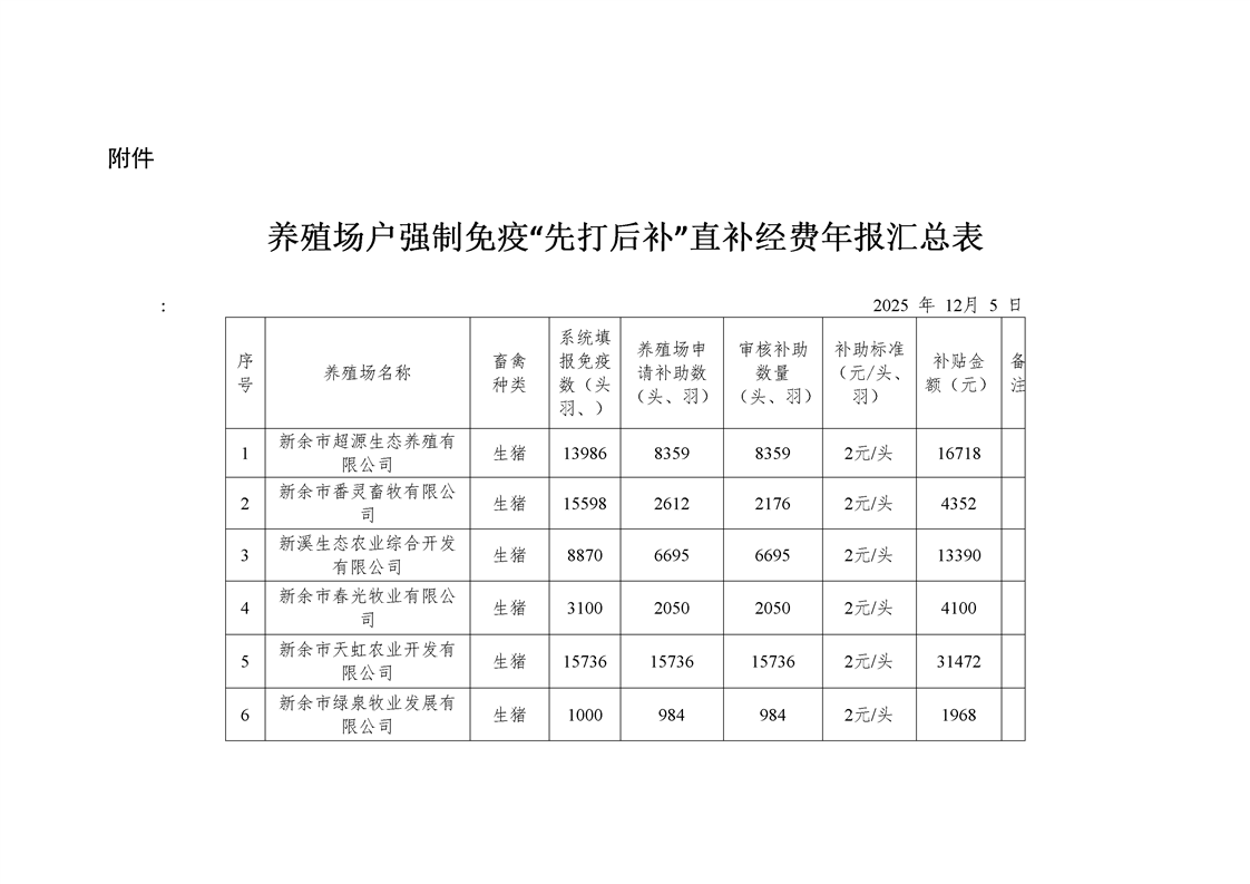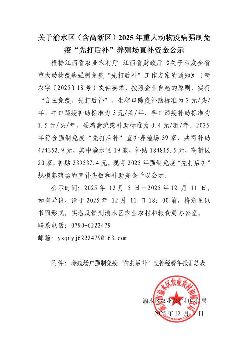 關(guān)于渝水區(qū)(含高新區(qū))2025年重大動(dòng)物疫病強(qiáng)制免疫補(bǔ)助補(bǔ)貼資金分配情況(“先打后補(bǔ)”)公示