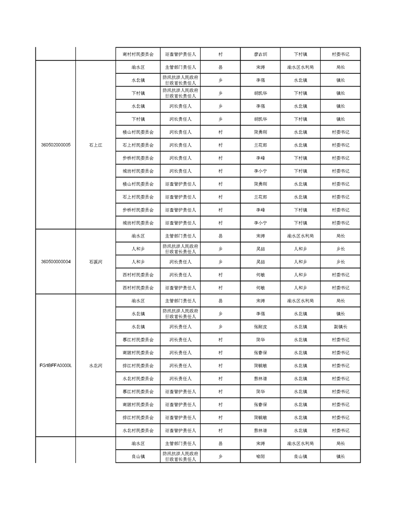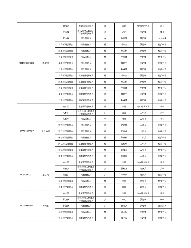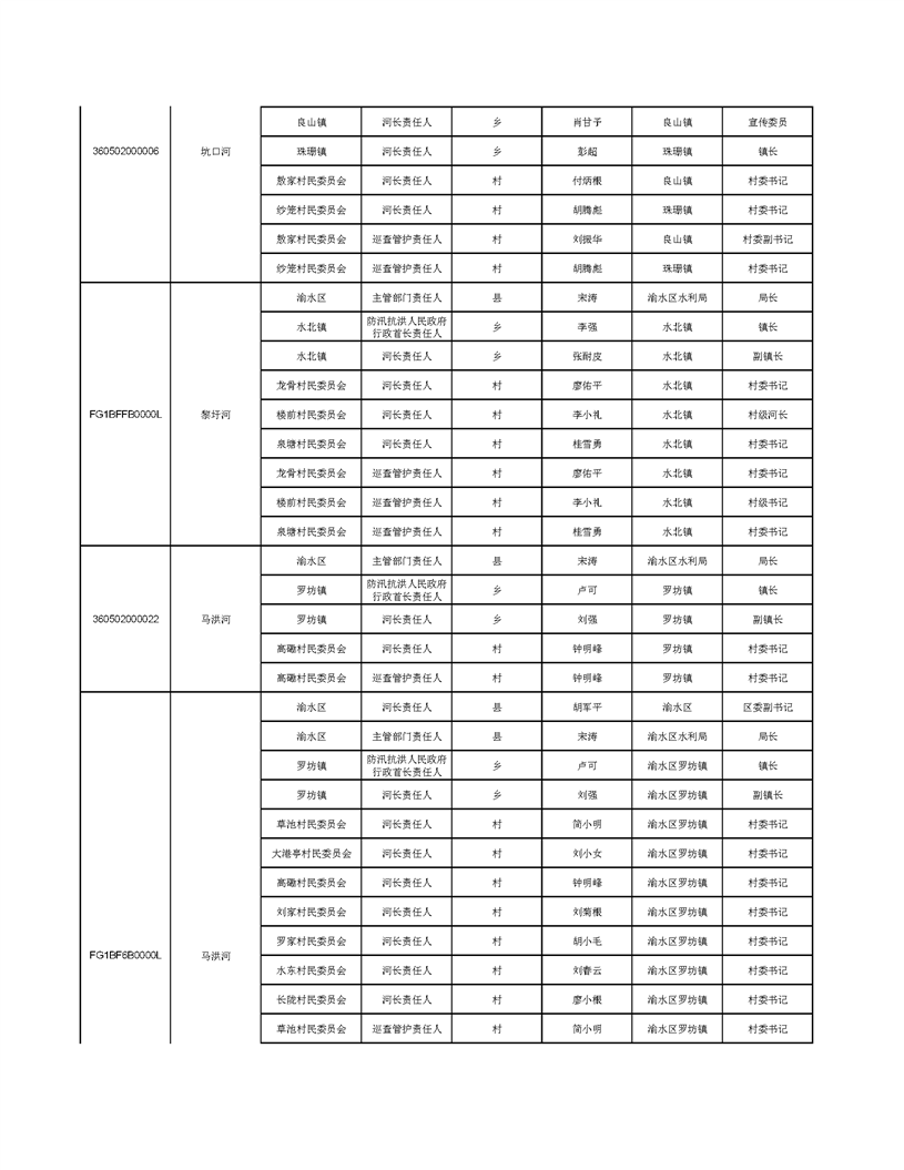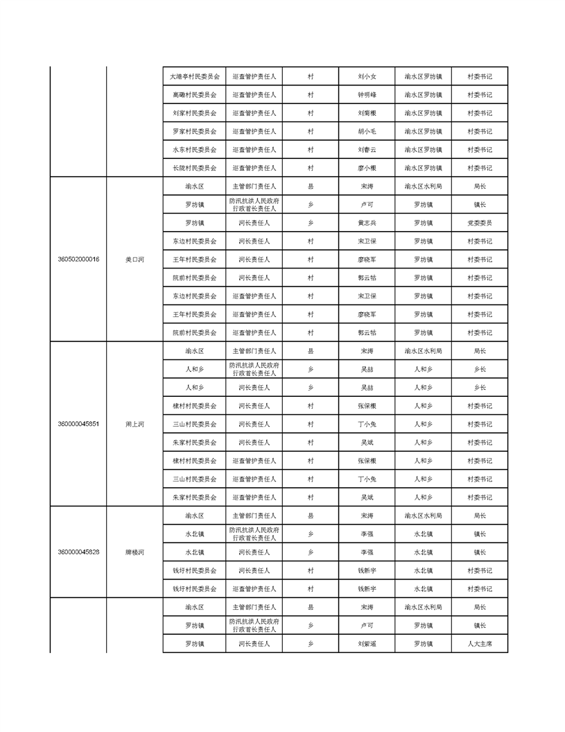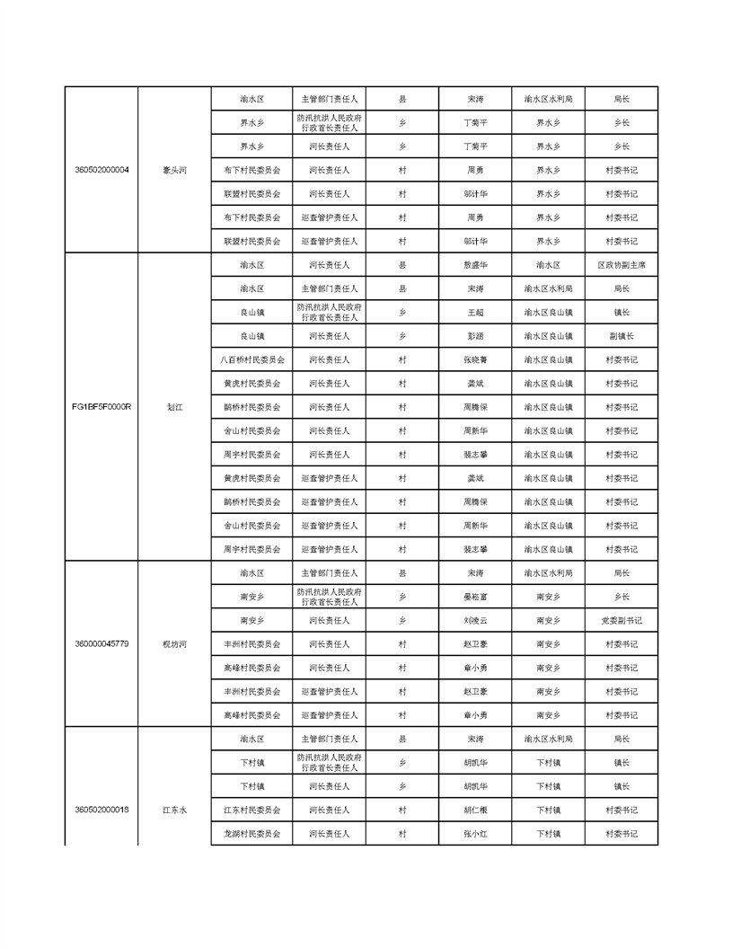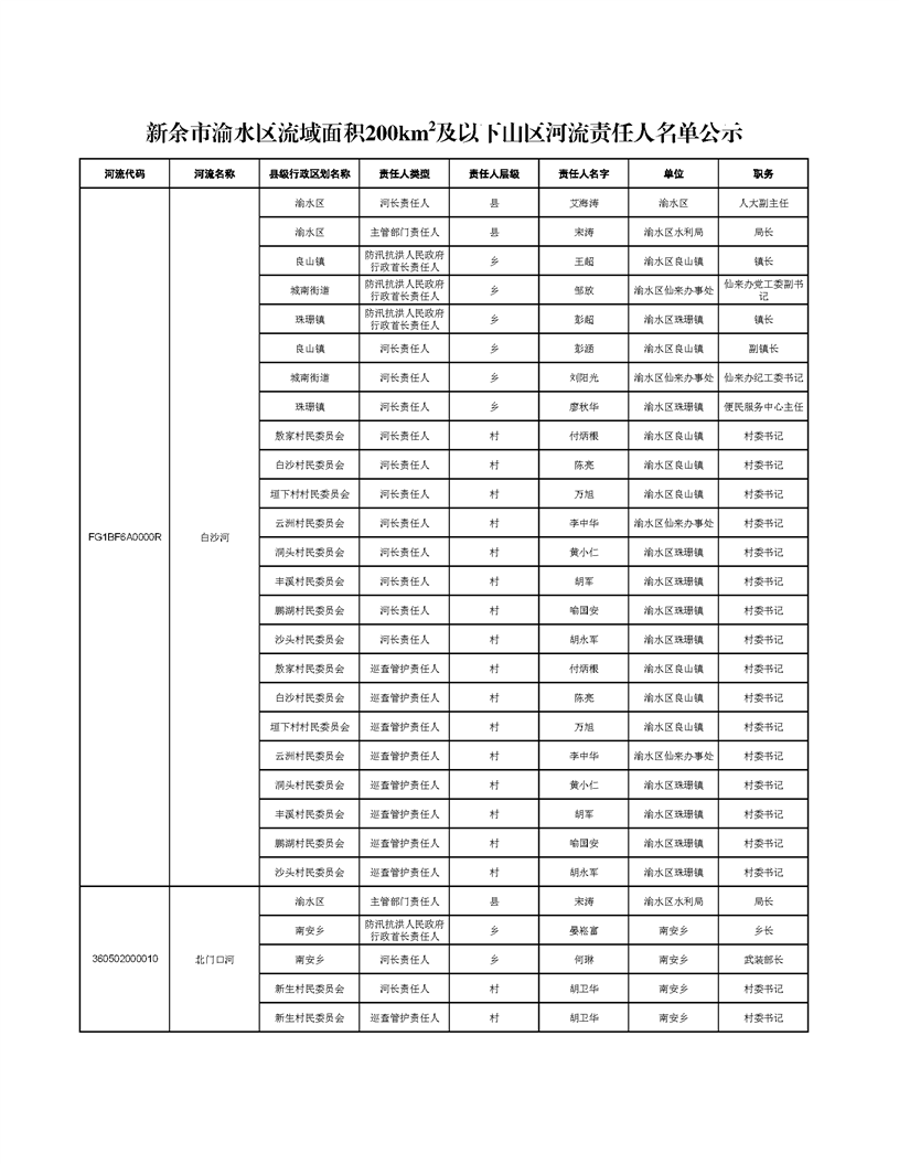 新余市渝水區流域面積200km2及以下山區河流責任人名單公示