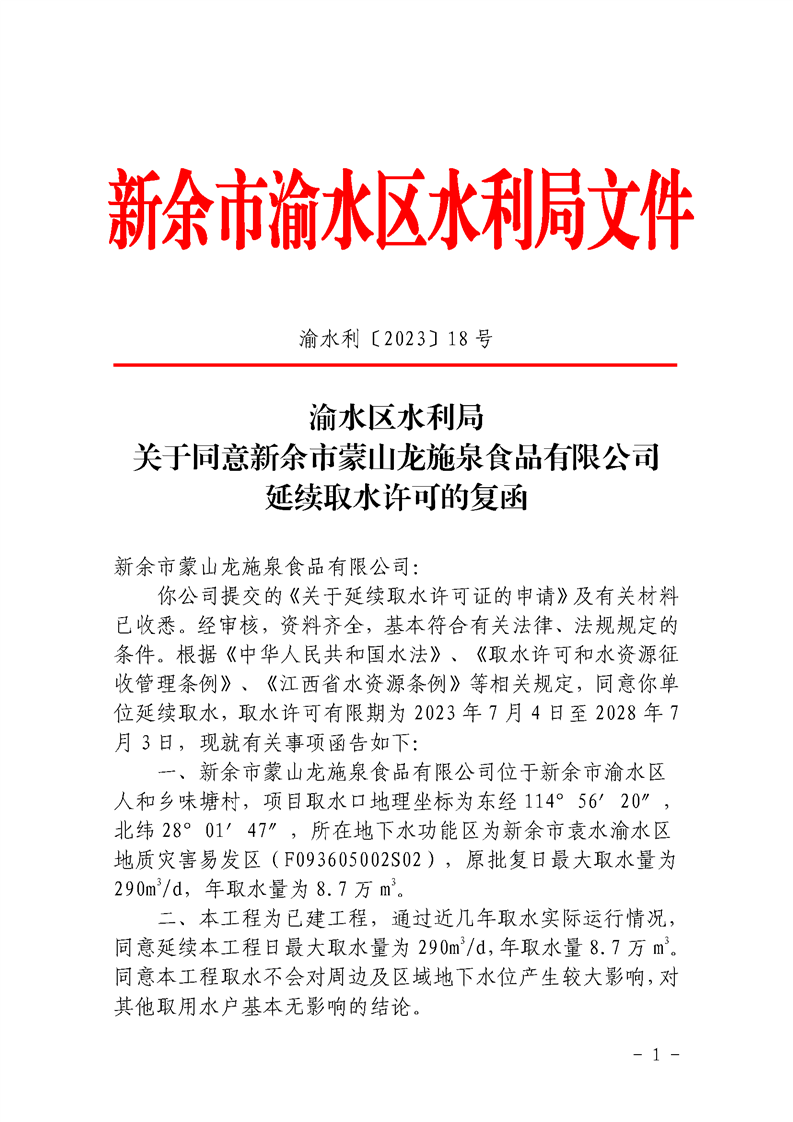 取水許可批復(fù)(新余市蒙山龍施泉食品有限公司延續(xù)取水許可的復(fù)函)