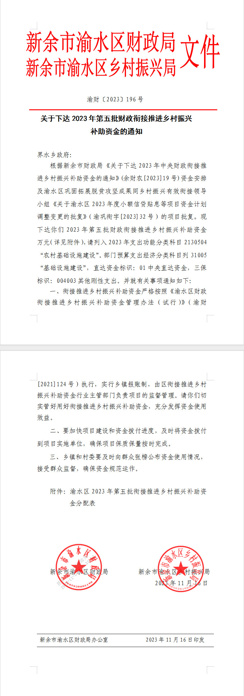 附件:渝水區2023年第五批銜接推進鄉村振興補助資金分配表