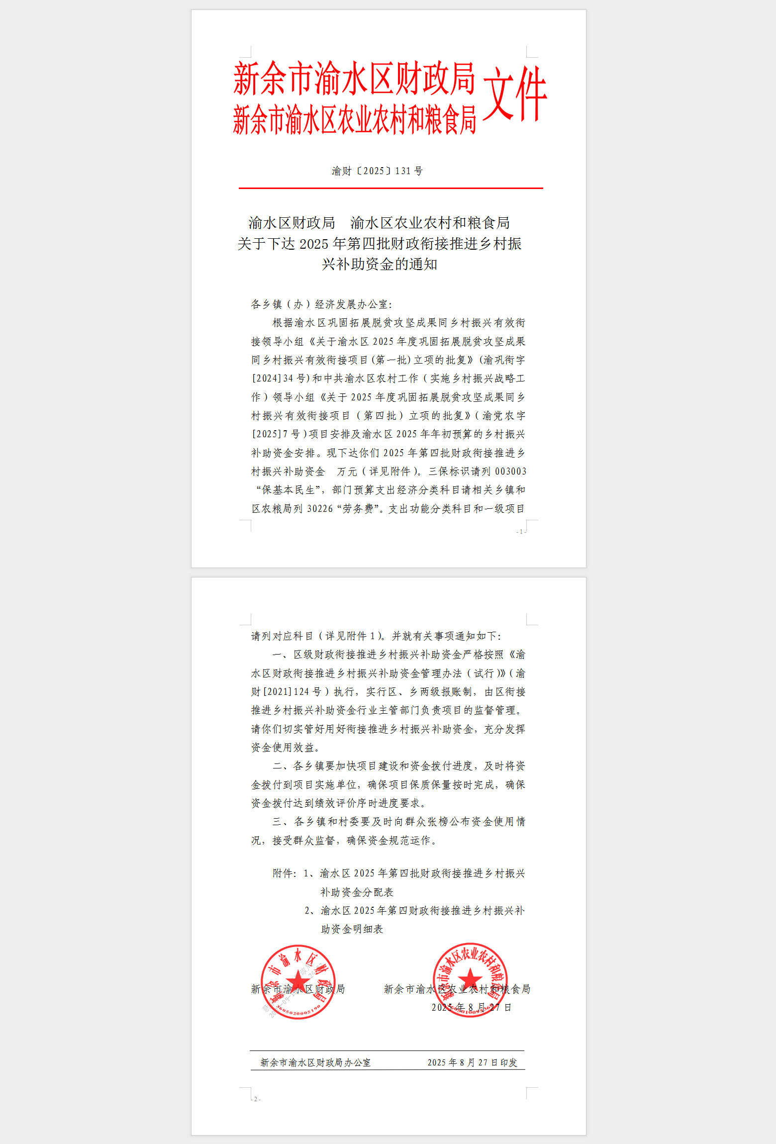 附件1:渝水區2025年第四批財政銜接推進鄉村振興補助資金分配表