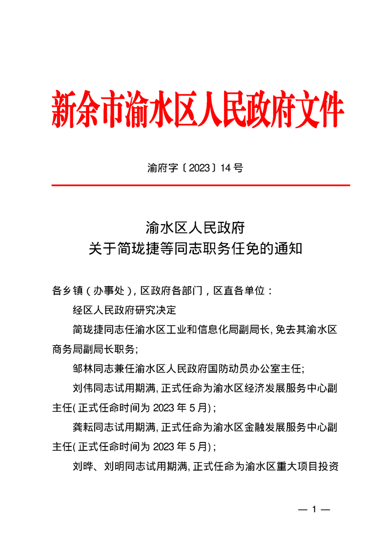 渝水區人民政府關于簡瓏捷等同志職務任免的通知