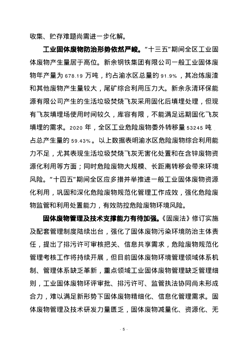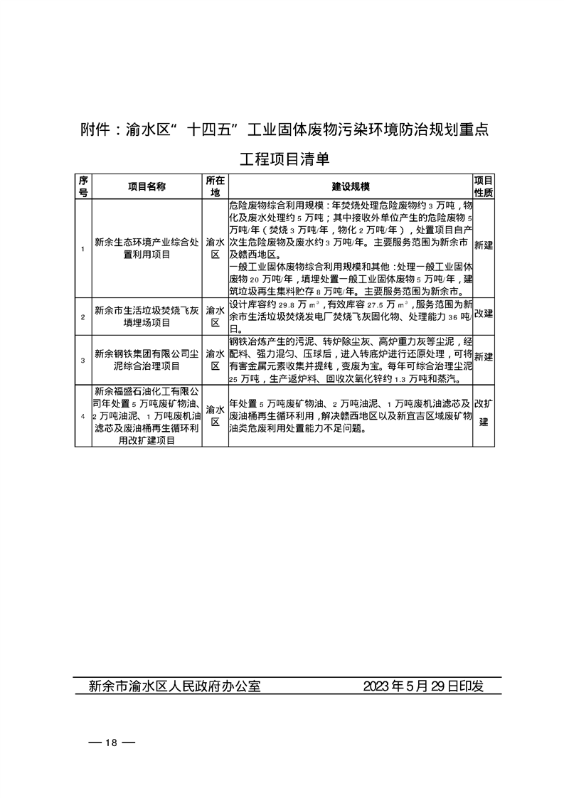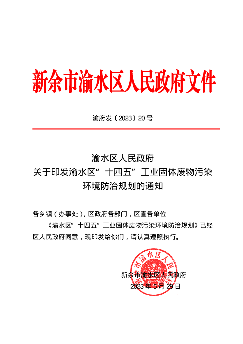 渝府發(fā)【2023】20號(hào) 渝水區(qū)人民政府關(guān)于印發(fā)渝水區(qū)“十四五”工業(yè)固體廢物污染環(huán)境防治規(guī)劃的通知