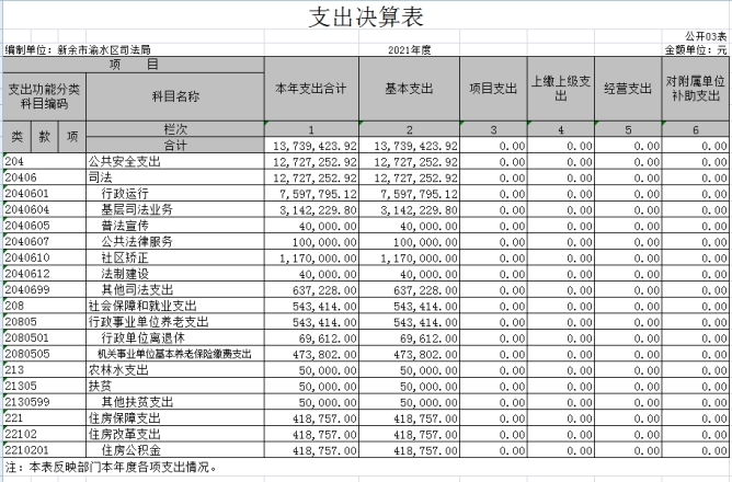 10、公共安全支出類司法款司法支出項(xiàng):反映司法行政部門發(fā)生的法學(xué)研究費(fèi)、司法協(xié)助費(fèi)、典型推廣和表彰費(fèi)、證書工本費(fèi)等支出。