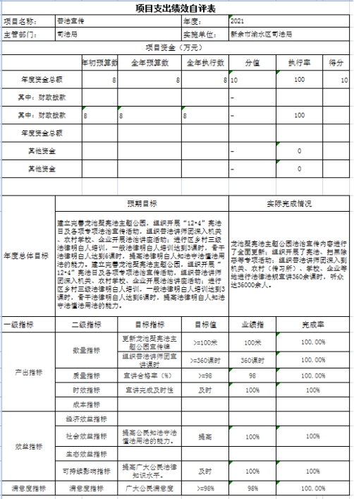 組織對“普法宣傳”這個項(xiàng)目開展了部門評價,涉及一般公共預(yù)算支出8萬元,政府性基金預(yù)算支出0萬元,國有資本預(yù)算支出0萬元。從評價情況來看,項(xiàng)目全年預(yù)算數(shù)為8萬元,執(zhí)行數(shù)為8萬元,完成預(yù)算的100%。