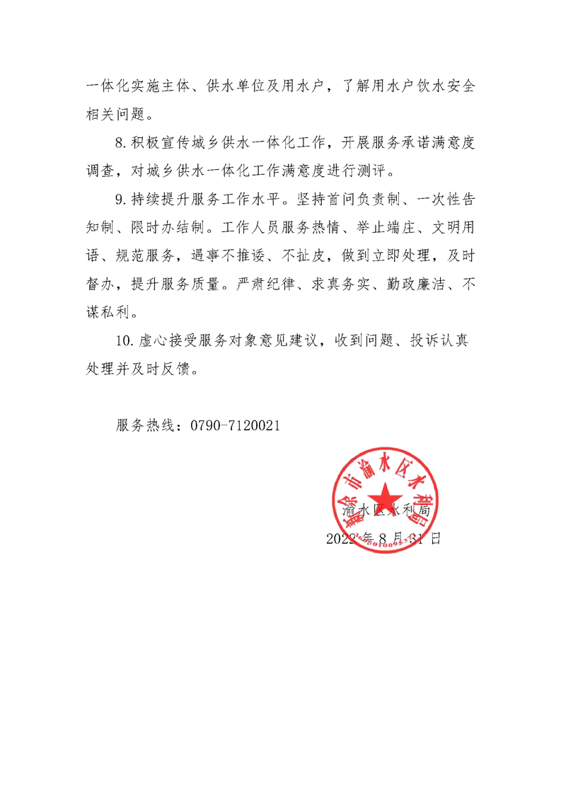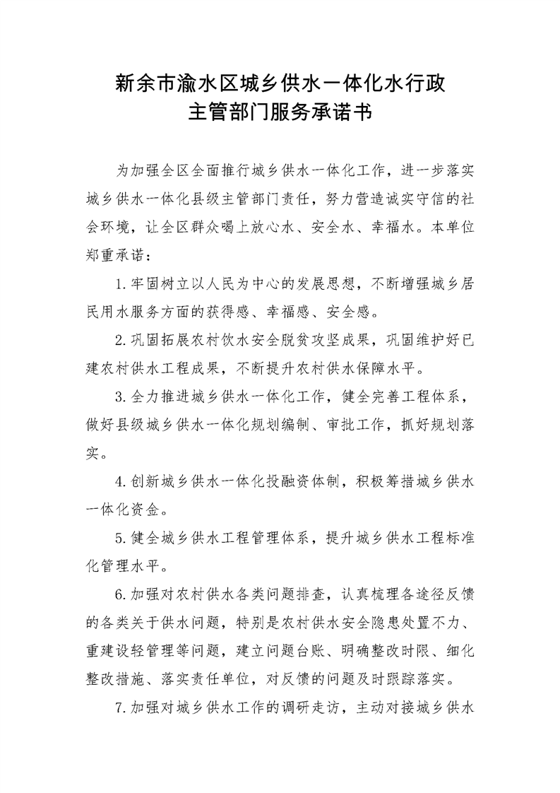 新余市渝水區城鄉供水一體化水行政主管部門服務承諾書