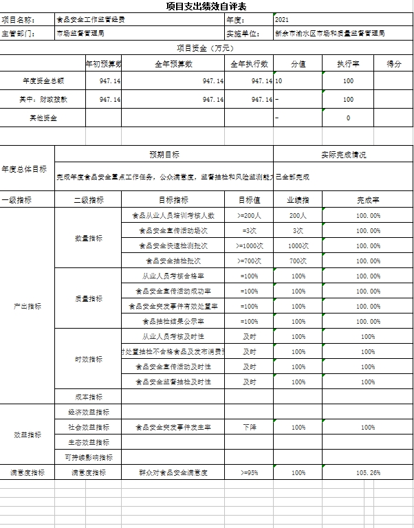 根據年初設定的績效目標,我局2021年部門決算項目績效自評得分為100分。項目全年預算數為947.14萬元,執行數為947.14萬元,完成預算的100%。項目績效目標完成情況:2021年共完成700批次的食品安全抽檢任務,1000批次的食品安全快速檢測任務,開展食品安全宣傳活動3次,培訓食品從業人員200人次,完成年度食品安全重點工作任務,公眾滿意度、監督