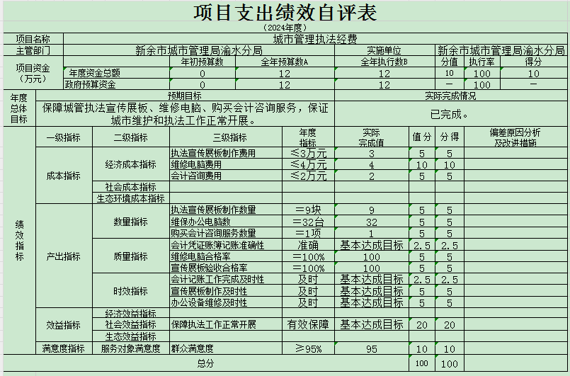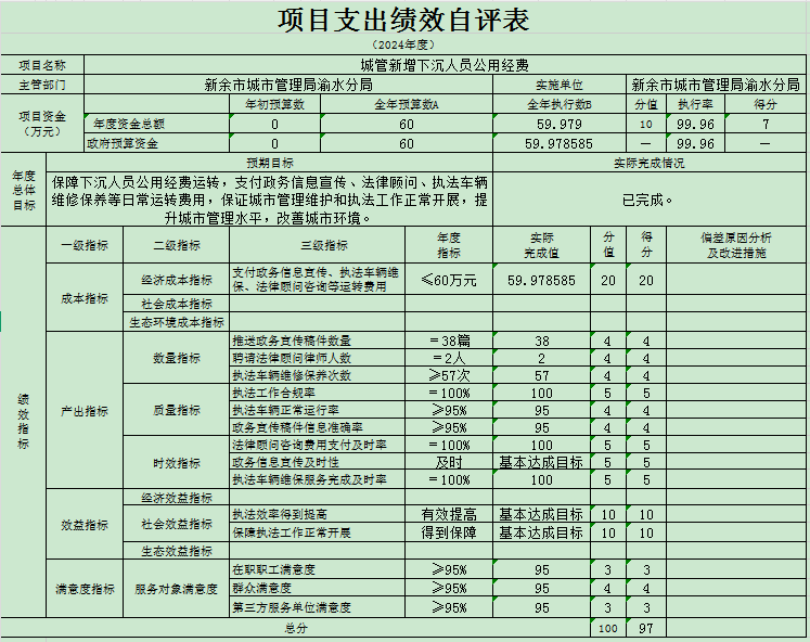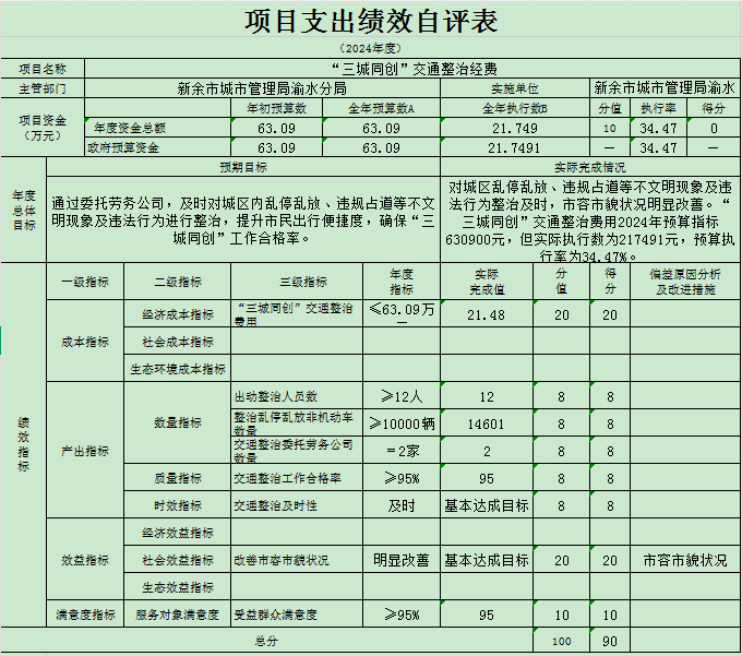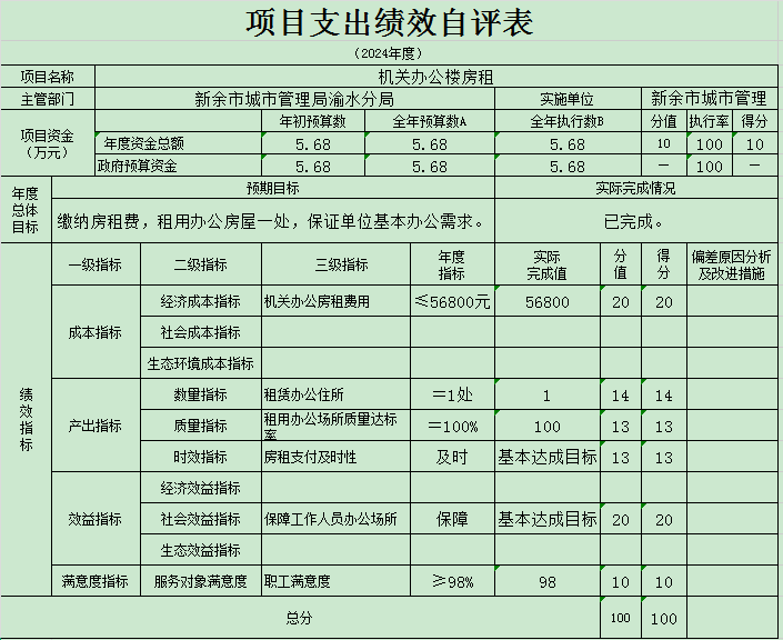 項目產出數量設置符合城市管理工作實際,經考核已全部實現預期目標。租賃辦公住所1處,租用辦公場所質量達標率100%,房租支付及時。