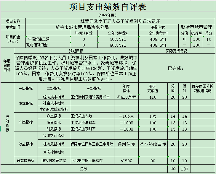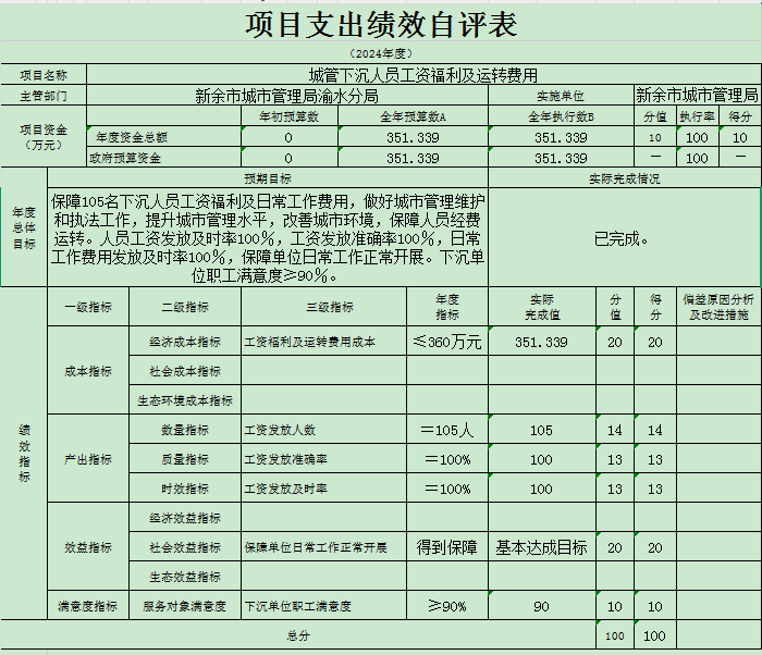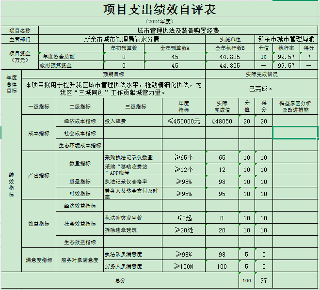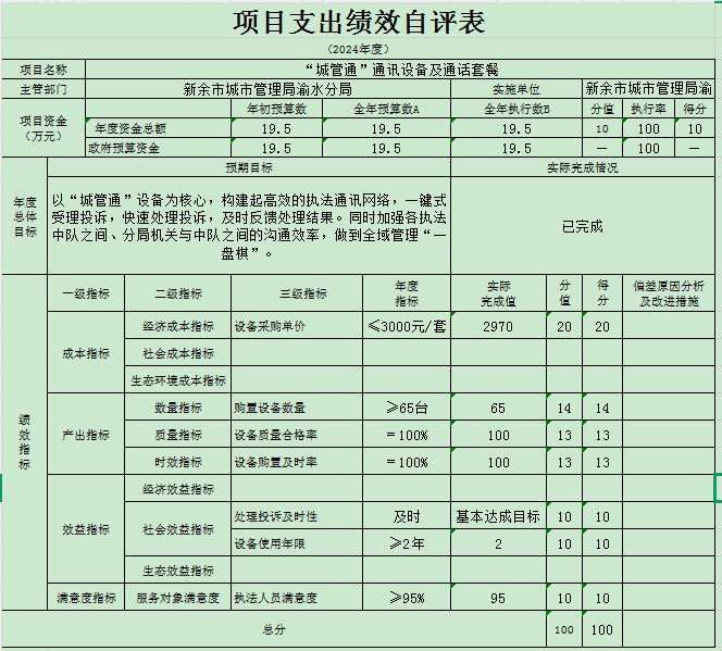 本次評價的指標分為項目決策、項目過程、項目產出、項目效益四個部分,滿分100分,評價得分為100分,評價等級為“優”(績效得分90分以上為“優”,75分-90分為“良”,60-75分為“中”,60分以下為“差”)。