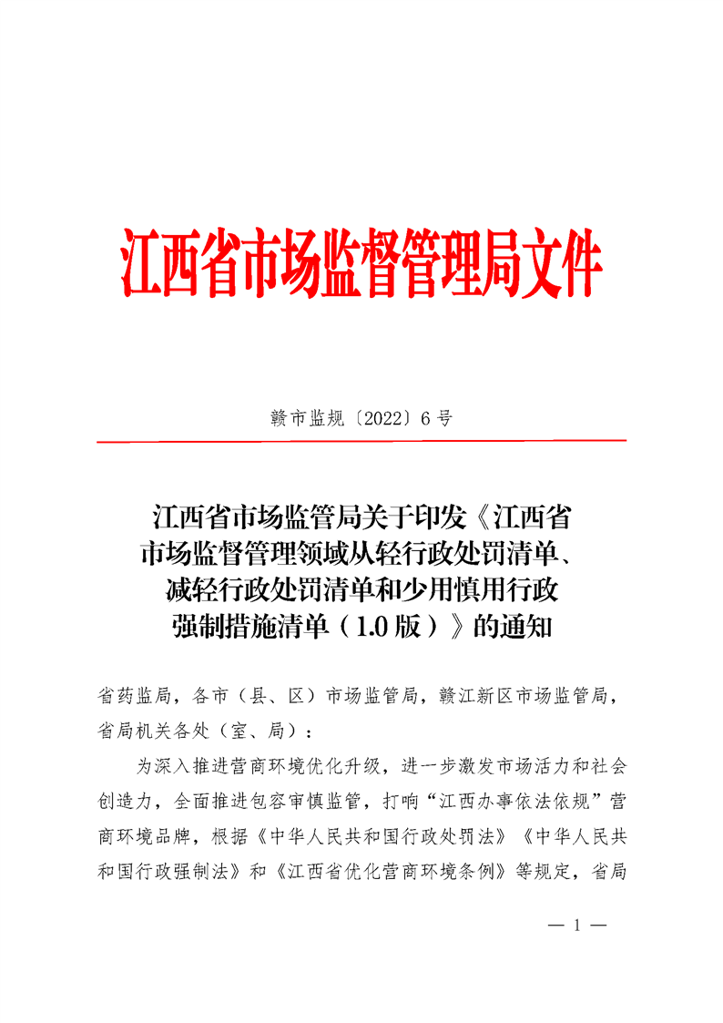 現將《江西省市場監督管理領域從輕行政處罰清單、減輕行政處罰清單和少用慎用行政強制措施清單(1.0 版)》印發給你們,請遵照執行。