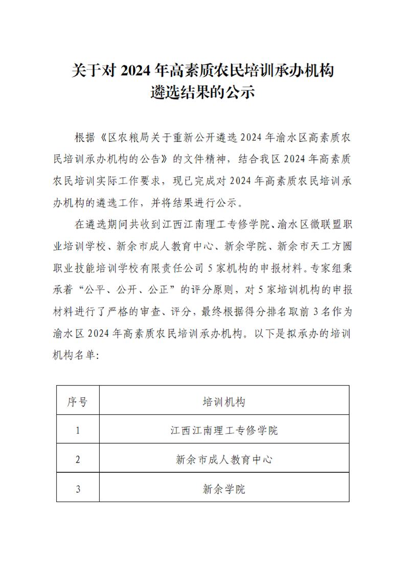 關于對2024年高素質農民培訓承辦機構遴選結果的公示