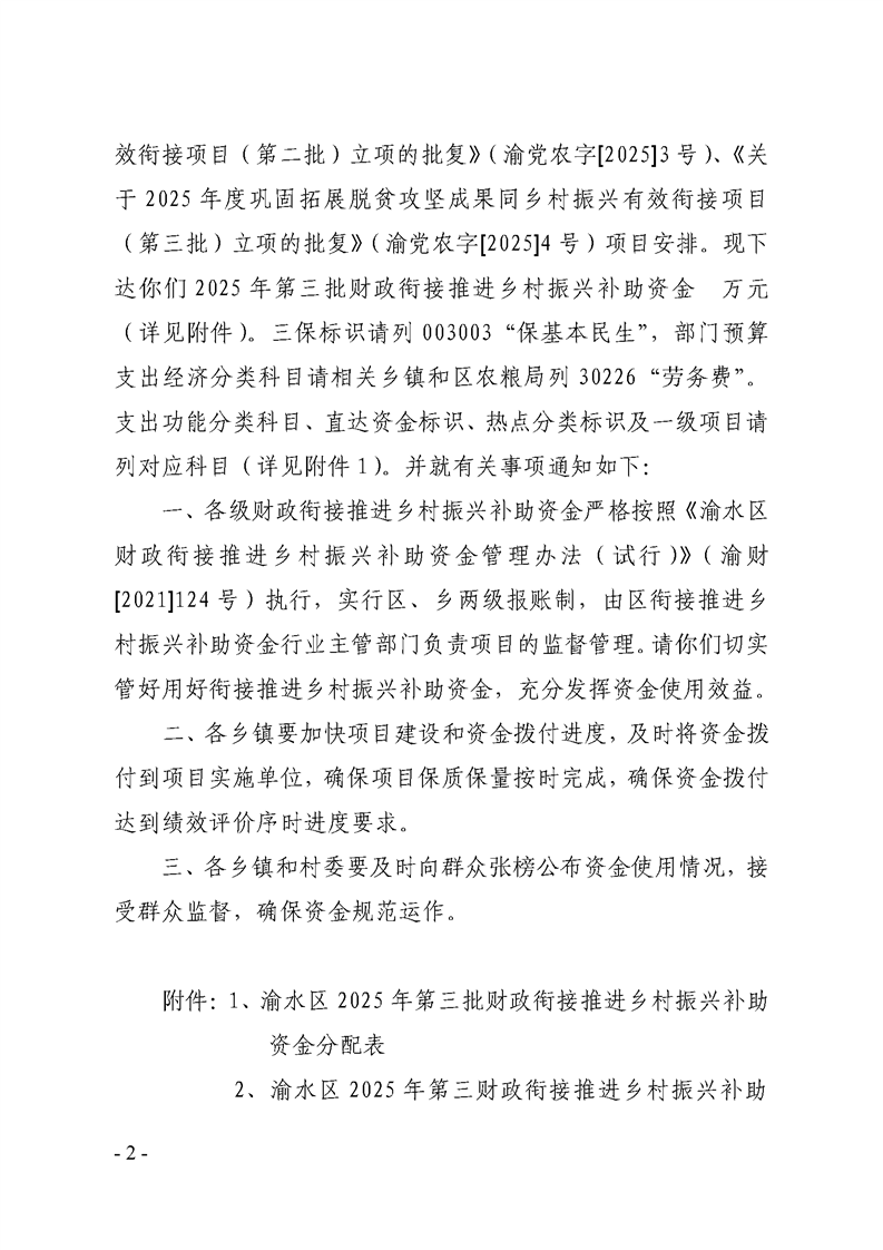 渝水區2025年第三批財政銜接推進鄉村振興補助資金分配計劃