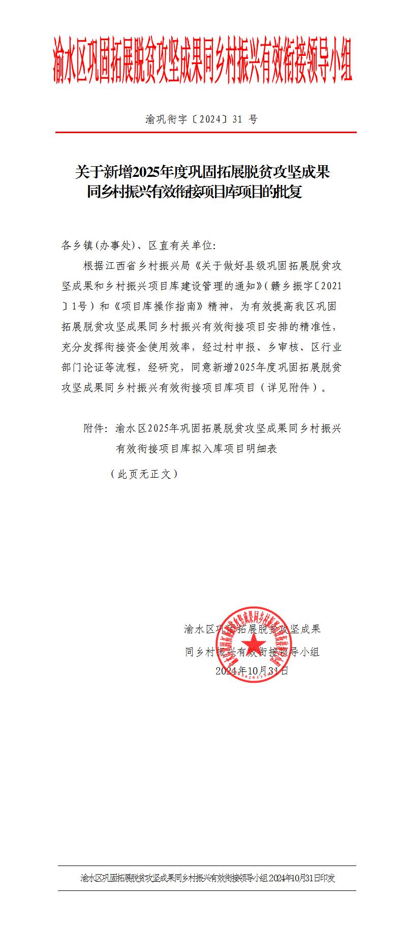 渝鞏銜字〔2024〕31號:渝水區新增2025年鞏固拓展脫貧攻堅成果同鄉村振興有效銜接項目庫項目明細表
