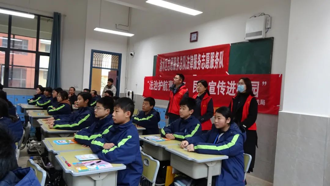 學生們對于整個法治課既好奇又緊張,每一個人的臉上都洋溢著認真的神情,坐姿保持著端正。主講人是區司法局普法與依法治理股股長胡明根,他用中國史學家司馬遷“法令者所以導民也,刑罰者所以懲奸也”的古語開篇,以故事為筆書寫一幅法治畫卷,寓教于樂,精彩非凡;他用提問的方式,以身邊實例為典構筑一場法治盛宴,通俗易懂,耐人回味。整個課程的內容分為三個部分:學法的意義與重要性,讓學生們知道為什么要學法;法在生活中無處不在,讓學生們了解有哪些法;為中華民族偉大復興而讀書識法,讓學生們明白怎么去使用法。胡股長著重強調第三部分,因為他認為學生們是發展中的人,是在經歷著青春期的人,是思想觀念尚不成熟的人,是需要用法治正確的觀念進行引導的人。他列舉古今中外名人的奮斗事跡,希望用自己法治的理念去引領學生走向正確的道路,去發奮讀書,去奮勇拼搏,為中華民族的偉大復興而讀書。“人生難得一拼搏,要以熱血寫春秋",最后,胡股長以一首《勸學》的勵志詩結束了宣講,教室里響起了長久不息的熱烈掌聲。