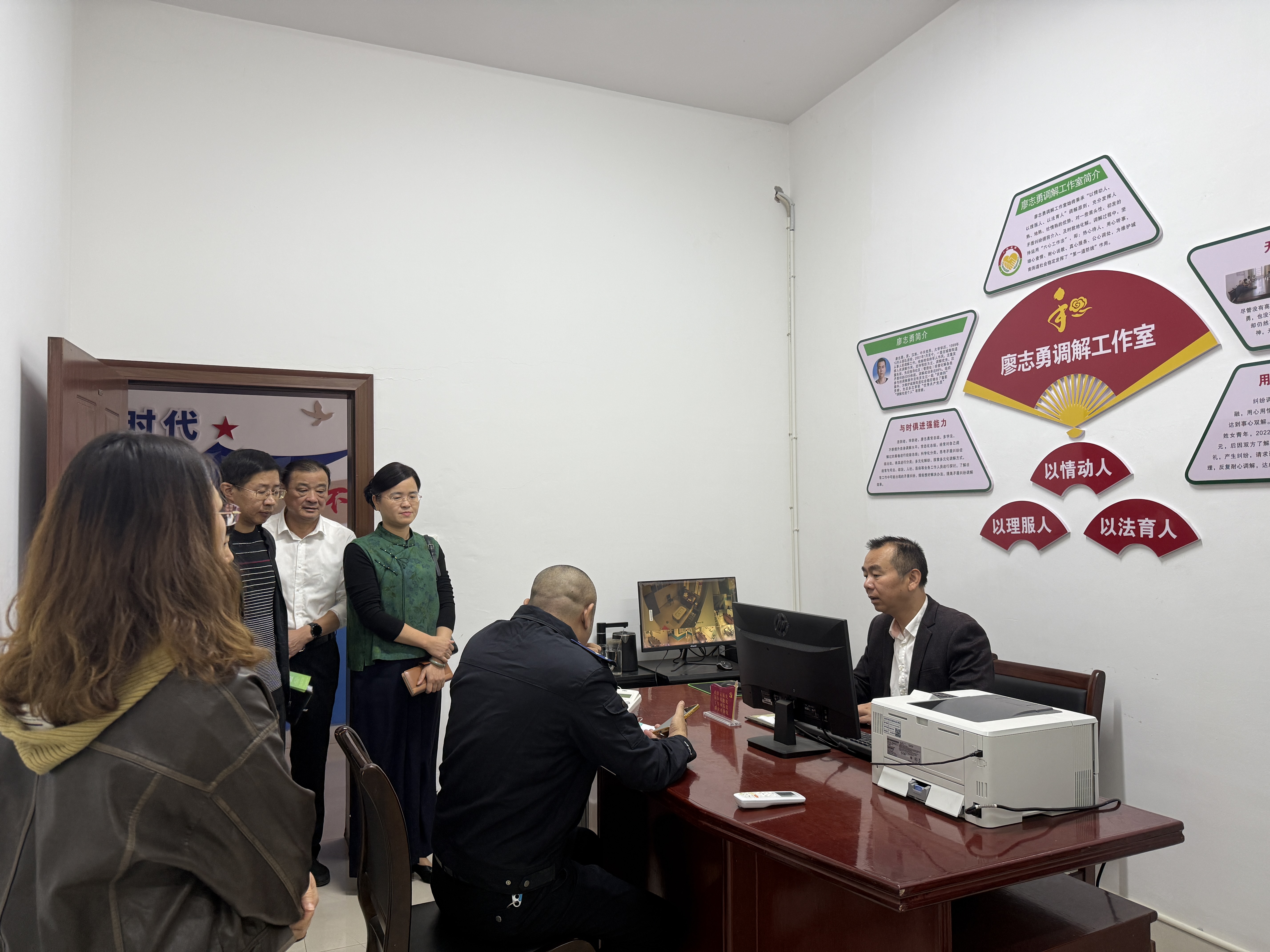 在工作人員帶領(lǐng)下,一行人先后參觀了公共法律服務(wù)工作站、廖志勇工作室、警調(diào)對(duì)接室、矛盾糾紛調(diào)解室等,通過實(shí)地觀摩、聽取介紹、現(xiàn)場(chǎng)問答、探討交流等方式,詳細(xì)了解我街道綜治中心的功能布局、運(yùn)行機(jī)制、工作流程等情況。