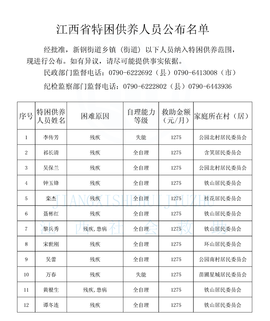 新鋼街道2026年2月份城鄉特困對象公示名單