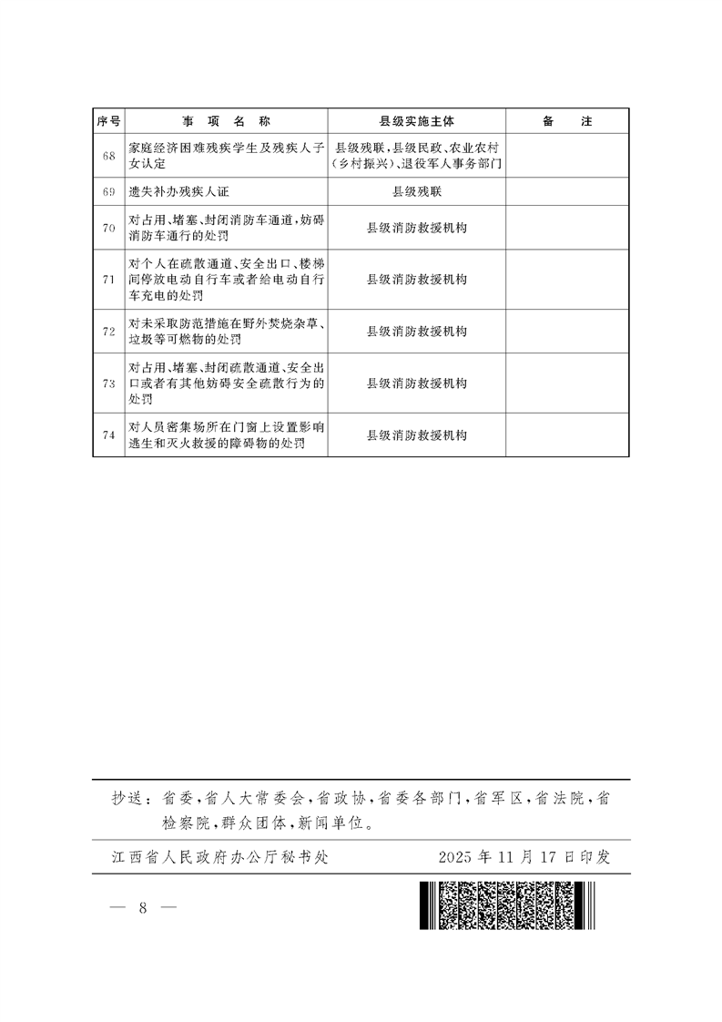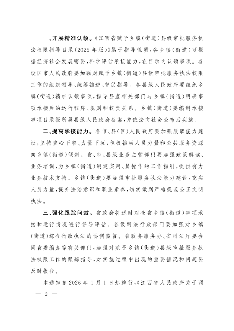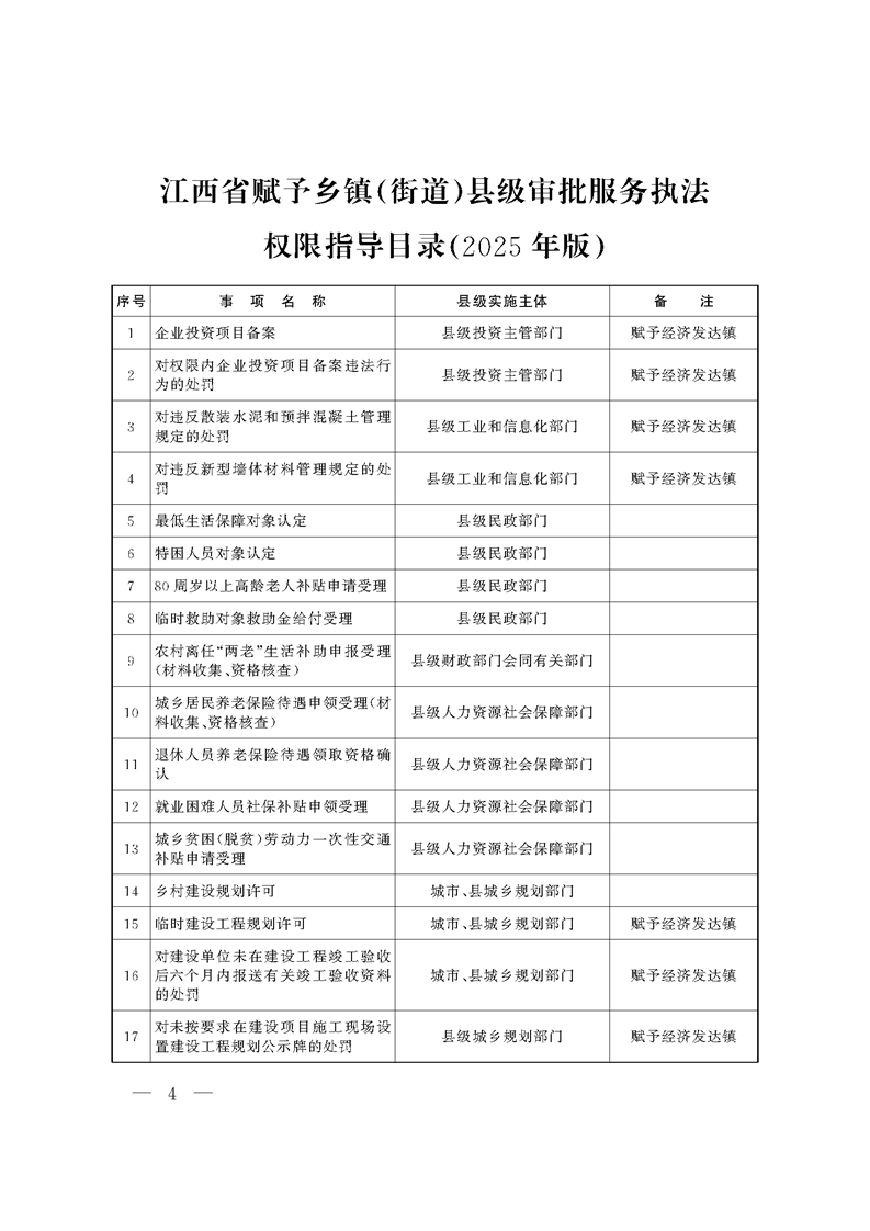 贛府發(fā)〔2025〕14號(hào)20251113y江西省人民政府關(guān)于印發(fā)《江西省賦予鄉(xiāng)鎮(zhèn)(街道)縣級(jí)審批服務(wù)執(zhí)法權(quán)限指導(dǎo)目錄(2025年版)》的通知