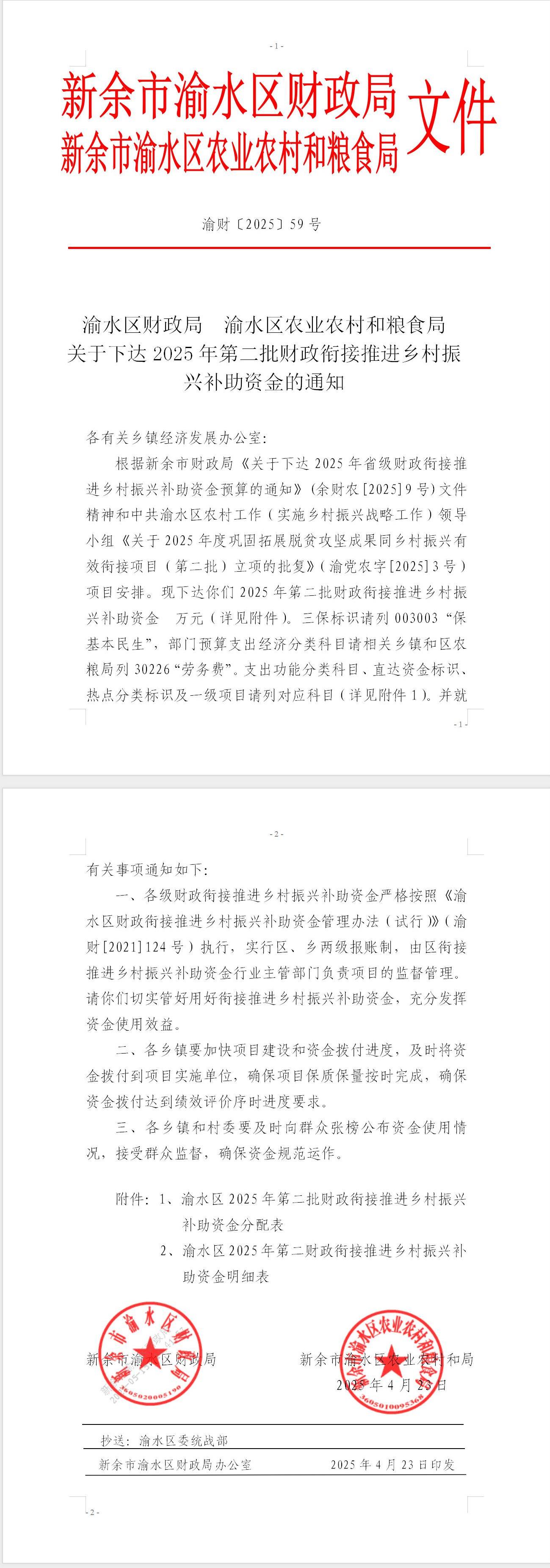 附件1:渝水區2025年第二批財政銜接推進鄉村振興補助資金分配表
