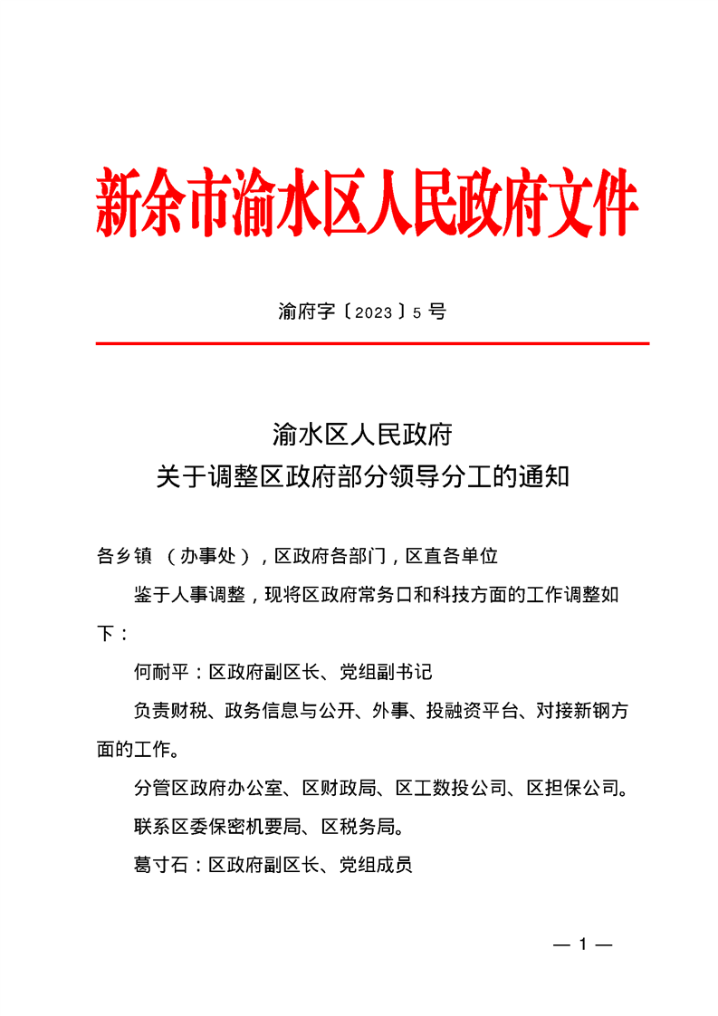 渝府字〔2023〕5號 渝水區人民政府關于調整區政府部分領導分工的通知