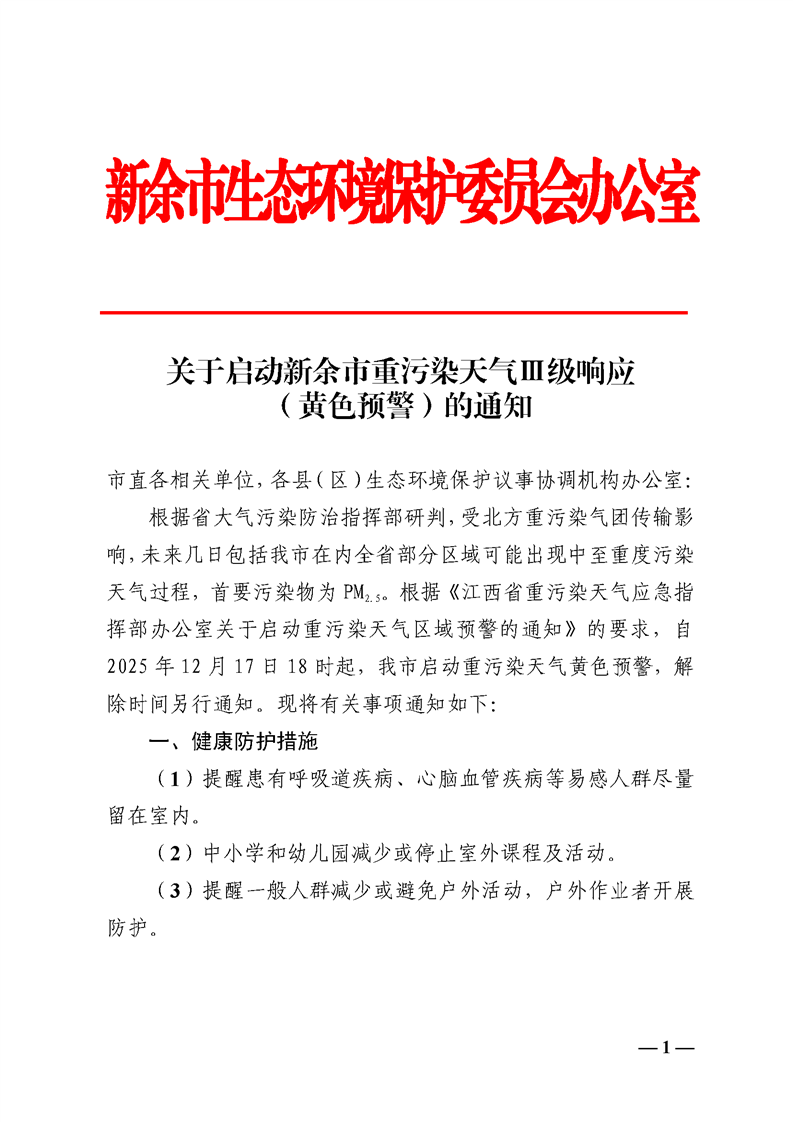 新余市重污染天氣Ⅲ級(jí)響應(yīng)(黃色預(yù)警)