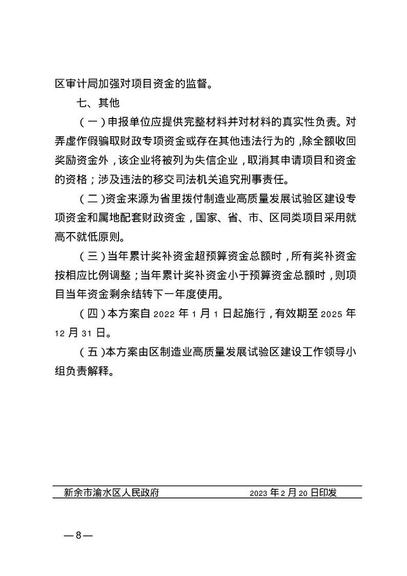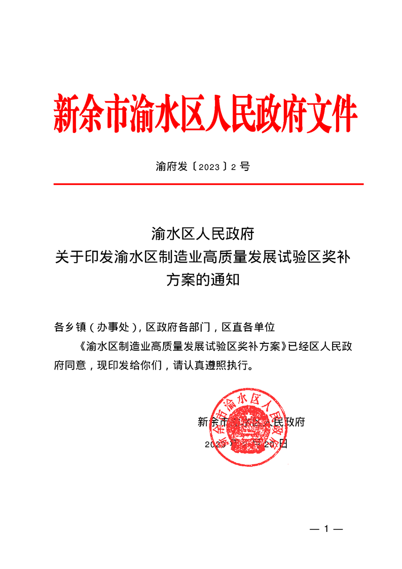 渝府發〔2023〕2號 渝水區人民政府關于印發渝水區制造業高質量發展試驗區獎補方案的通知