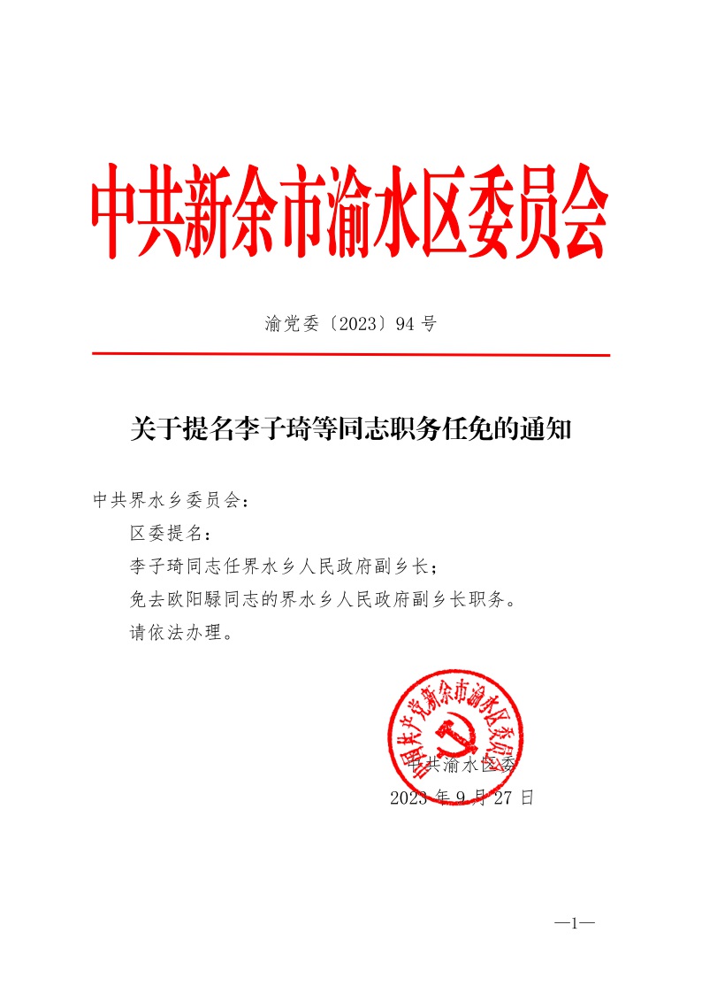 關(guān)于提名李子琦等同志職務(wù)任免的通知