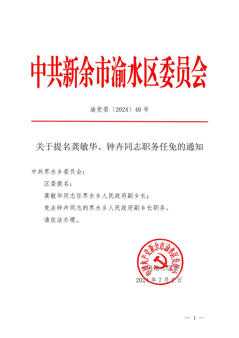 關于提名龔敏華、鐘卉同志職務任免的通知