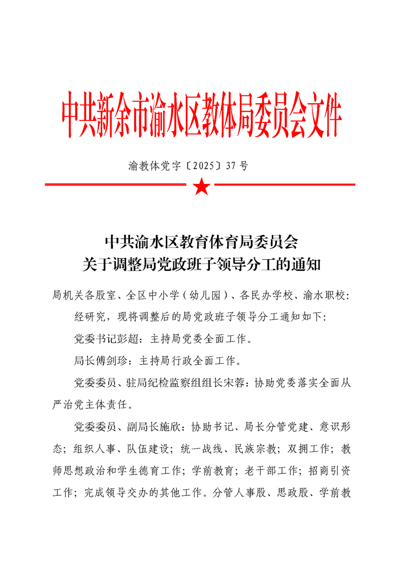 中共渝水區(qū)教體局委員會關(guān)于局黨政班子領(lǐng)導和機關(guān)工作人員分工的通知