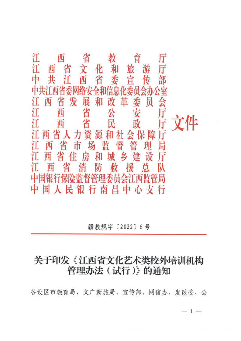 贛教規字〔2022〕6號關于印發《江西省文化藝術類校外培訓機構管理辦法(試行)》的通知