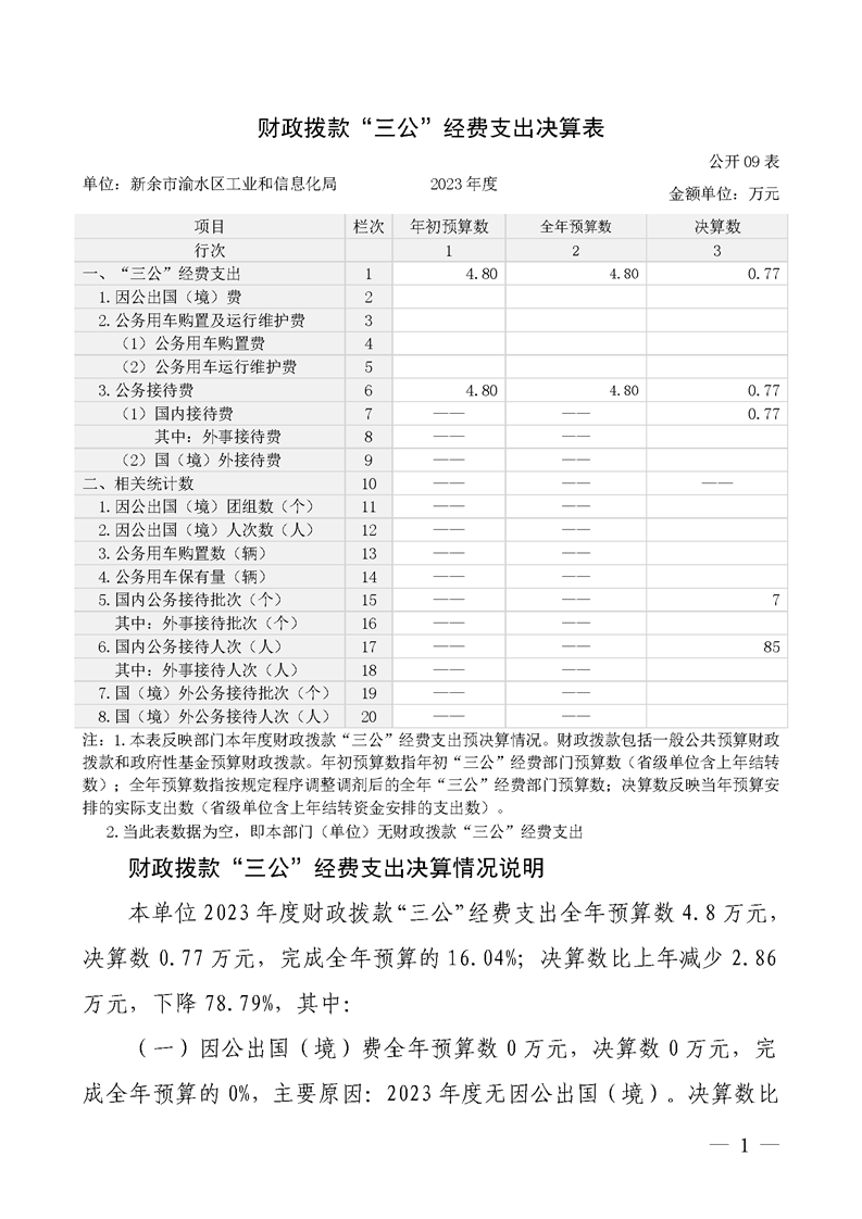 2023年度新余市渝水區工業和信息化局“三公”經費支出決算公開