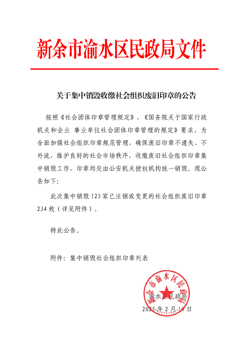 關(guān)于集中銷毀2024年度收繳社會組織廢舊印章的公告