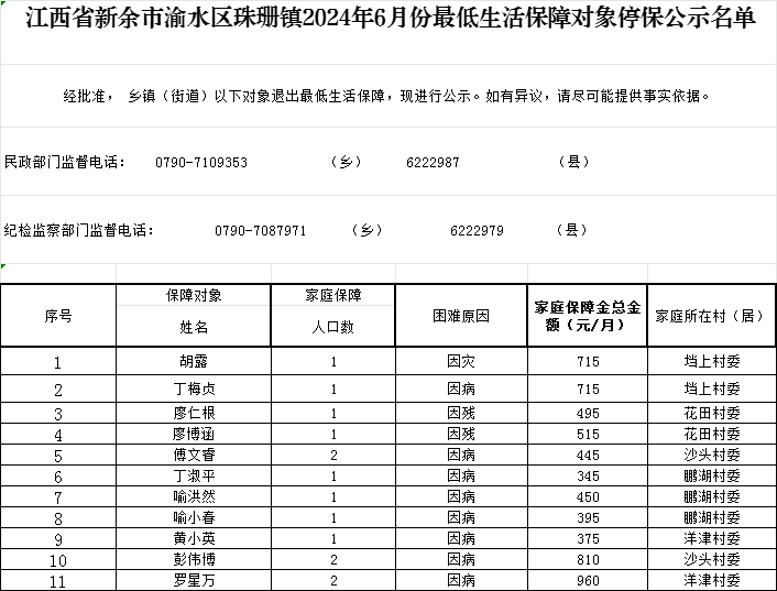 珠珊鎮2024年6月份最低生活保障對象停保公示名單