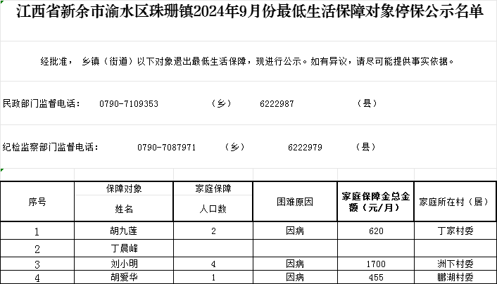 江西省新余市渝水區(qū)珠珊鎮(zhèn)2024年9月份最低生活保障對象停保公示名單