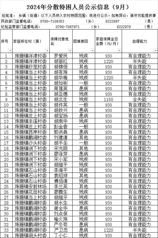 2024年珠珊鎮(zhèn)分散特困人員公示信息(9月)