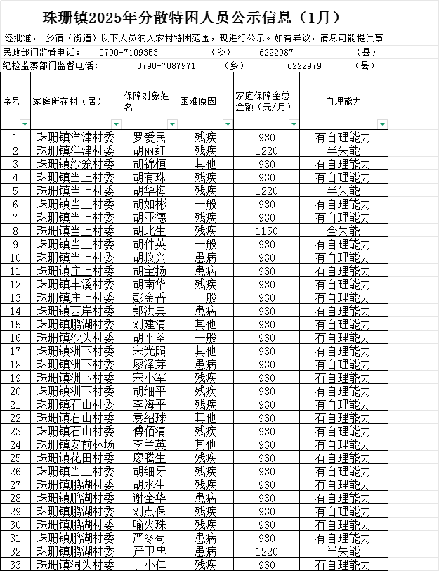 珠珊鎮2025年分散特困人員公示信息(1月)