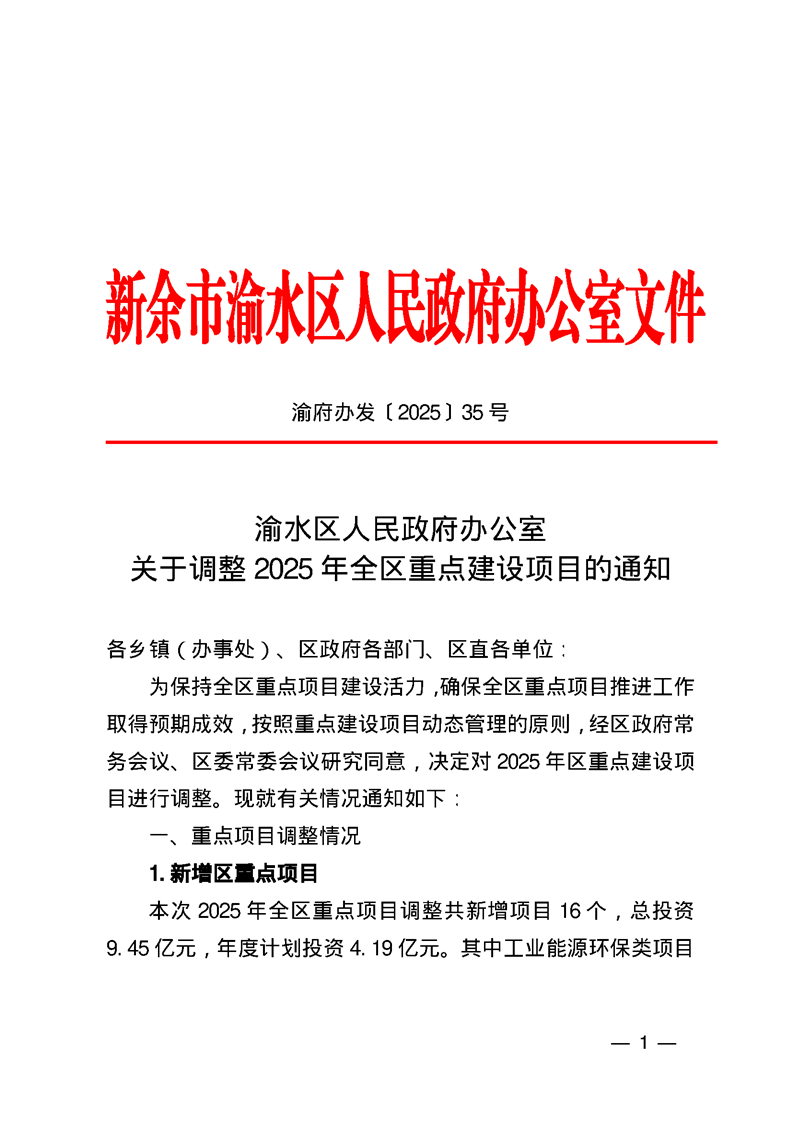 渝府辦發(fā)〔2025〕35號 渝水區(qū)人民政府辦公室關于調(diào)整2025年全區(qū)重點建設項目的通知