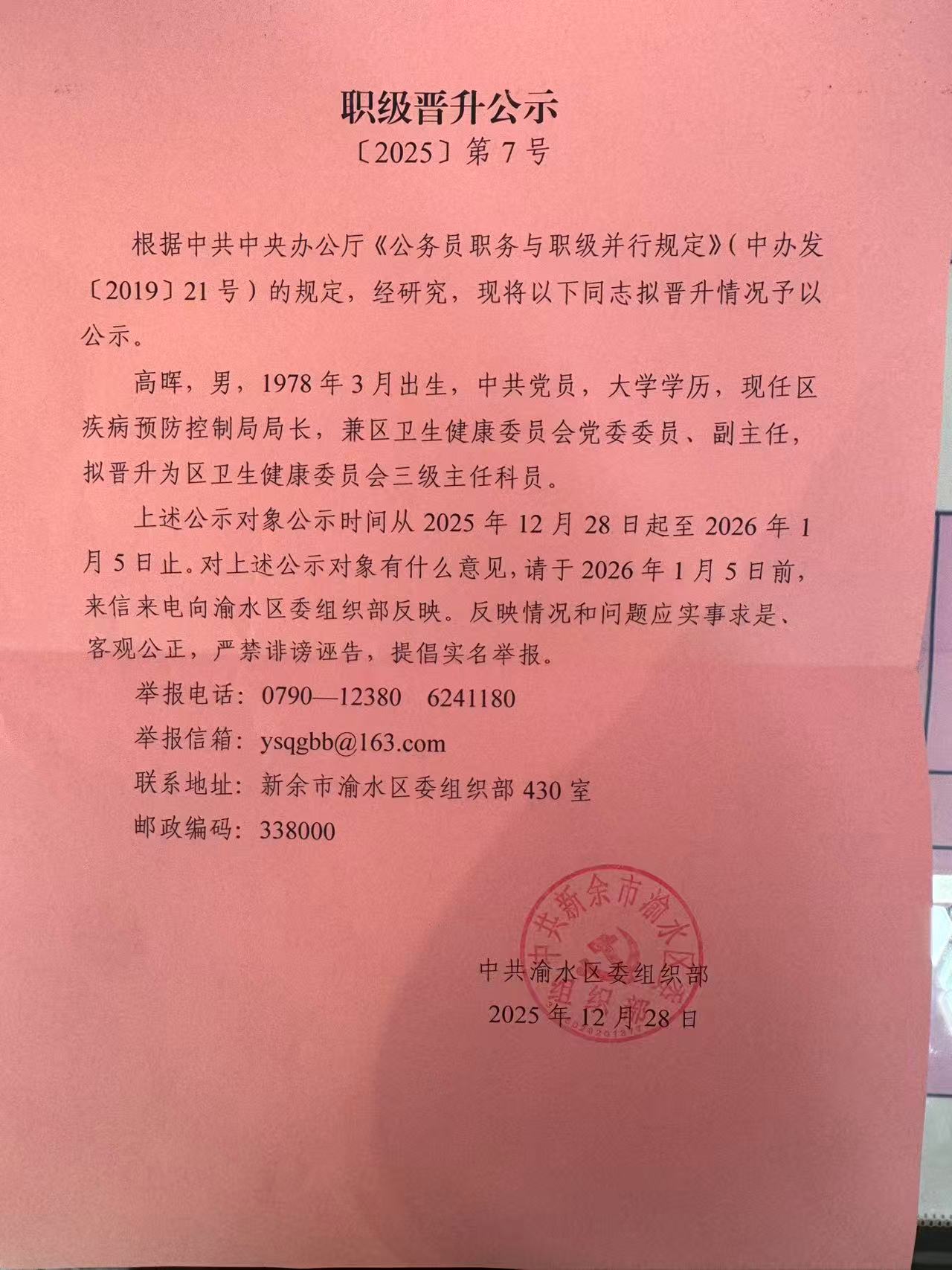 信息索取號: 3605020001-2026-00056 發布日期: 2025-12-28 責任部門: 渝水區衛生健康委員會