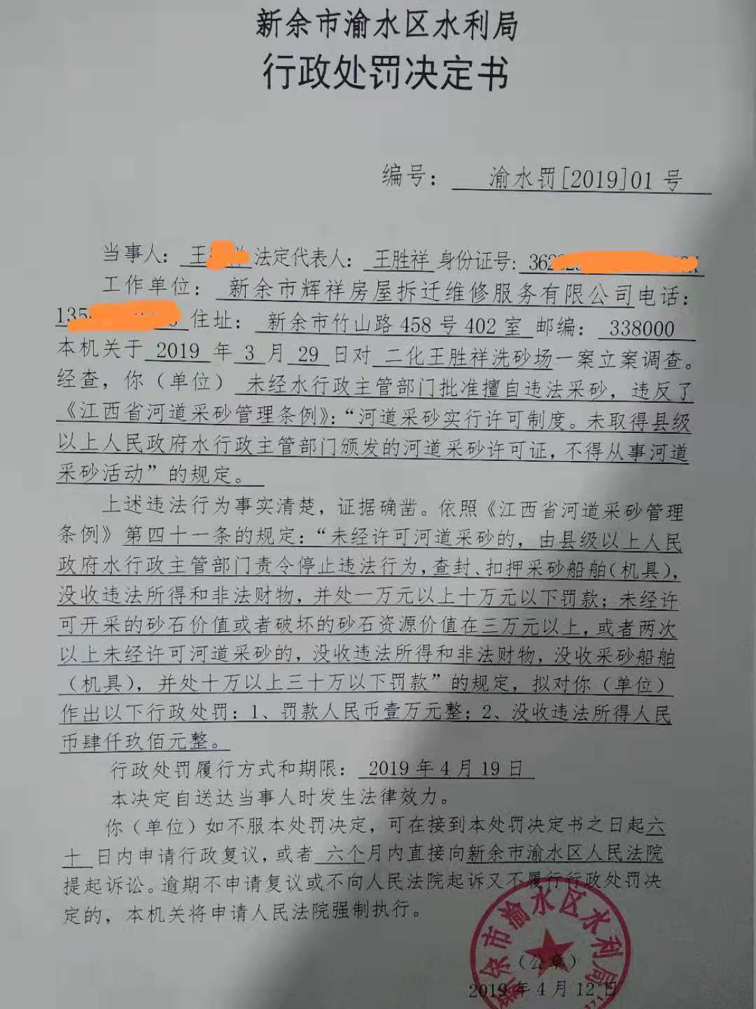 關于對王勝祥洗砂場非法采砂行政處罰決定的公示(公示時間:2019年4月12日至2019年4月22日)