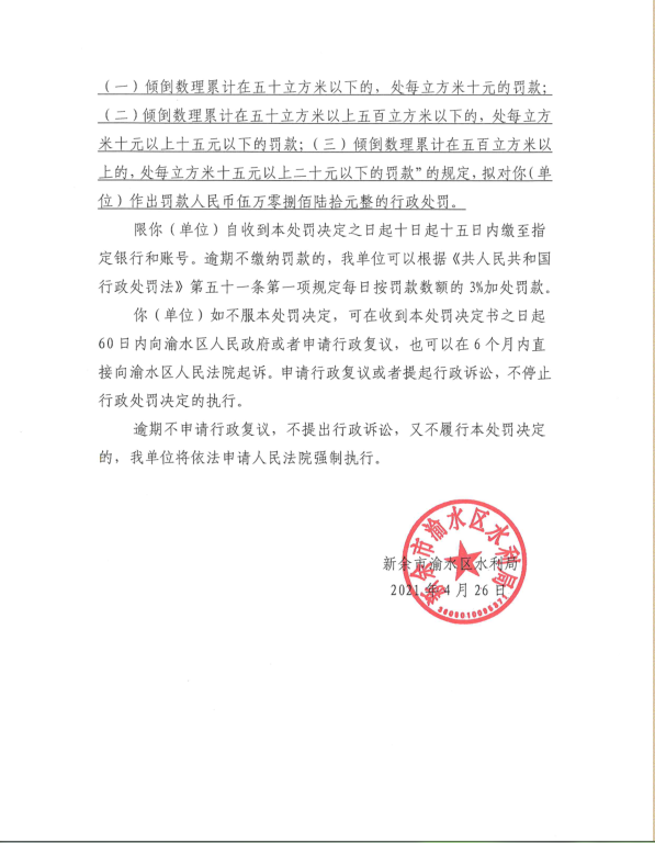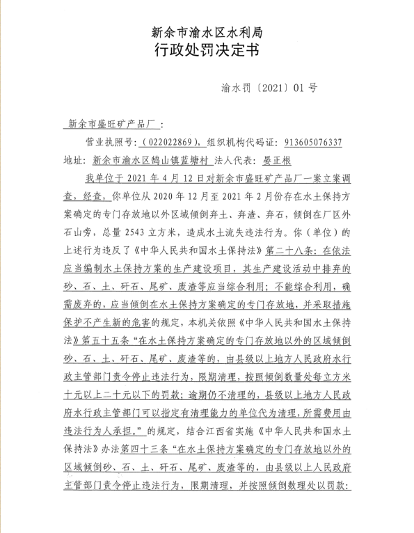 新余市渝水區(qū)水利局行政處罰決定書(新余盛旺礦產(chǎn)品廠)