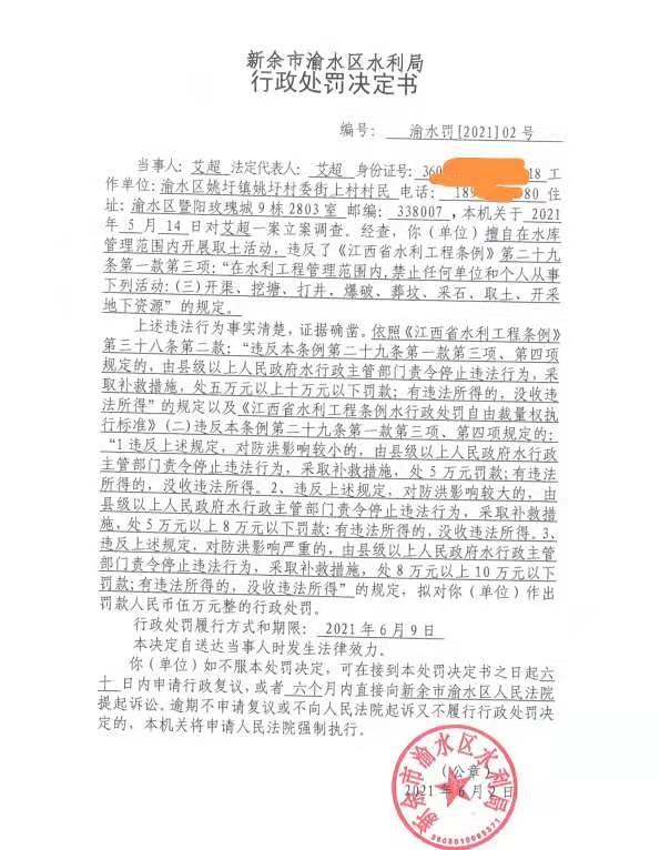新余市渝水區(qū)水利局行政處罰決定書(艾超個人)