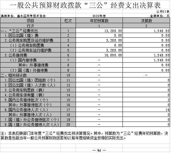 (十四)“三公”經費:納入區財政預決算管理的“三公”經費,是指各部門用財政撥款安排的因公出國(境)費、公務用車購置及運行費和公務接待費。其中,因公出國(境)費反映單位公務出國(境)的國際旅費、國外城市間交通費、住宿費、伙食費、培訓費、公雜費等支出;公務用車購置及運行費反映單位公務用車車輛購置支出(含車輛購置稅)及租用費、燃料費、維修費、過路過橋費、保險費、安全獎勵費用等支出;公務接待費反映單位按規定開支的各類公務接待(含外賓接待)支出。