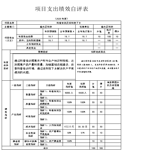 項目績效自評總體綜述:根據年初設定的績效目標,科普培訓和送科技下鄉項目績效自評得分為100分。項目全年預算數為 17.9萬元,執行數為17.9萬元,完成預算的100%。項目績效目標完成情況:按照項目績效目標確定的時限內完成了工作任務,圓滿完成此項工作。發現的問題及原因:一是在項目儲備和項目申報質量上還有待提高;2、項目實施質量有待提高,跟蹤瓿效有待提高。下一步改進措施:一是加強改進措施,提高業務水平;二是加強管理,完善制度,經費使用,績效考評制度,提高項目實施水平;3、做好項目儲備,對項目進行分類指導,提高項目資金使用效益。