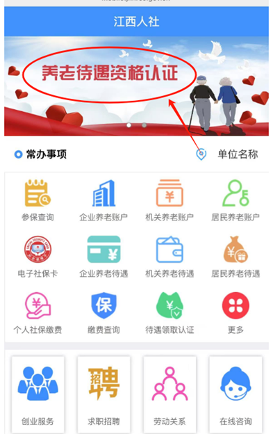 (4)“江西人社”首頁,點擊最上端“養老待遇資格認證”專區(如圖):