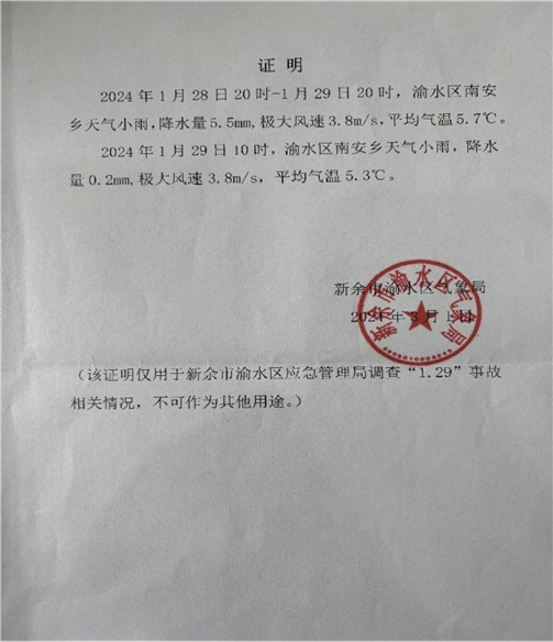 事故發生后,區委、區政府高度重視,并要求做好善后工作,涉事企業要舉一反三,排查隱患,確保安全生產措施落實到位。2024年1月30日,市安委會對渝水區人民政府下達《新余市安全生產委員會關于對新余市渝水區南安鄉“1 ·29”一般生產安全事故掛牌督辦通知書》(余安字〔2024〕5號),對本事故進行掛牌督辦。