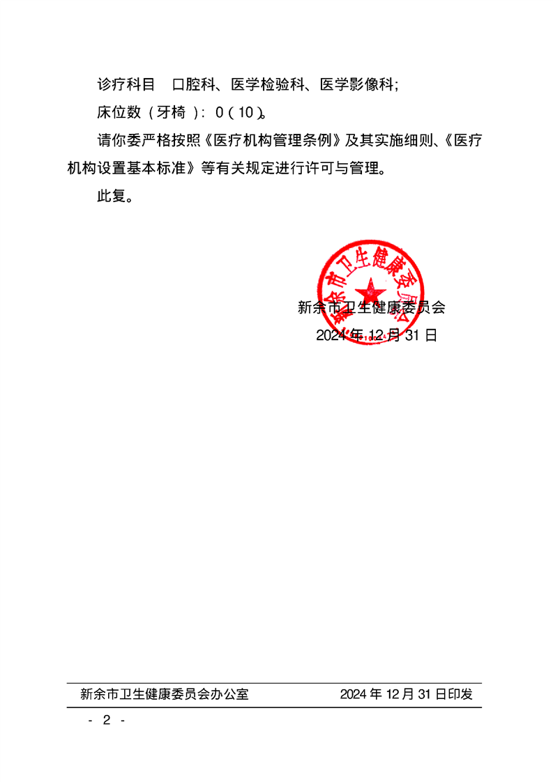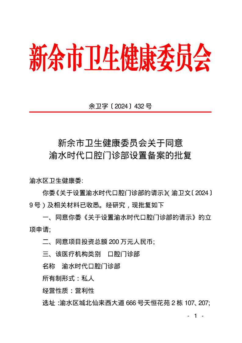 新余市衛生健康委員會關于同意渝水時代口腔門診部設備備案的批復