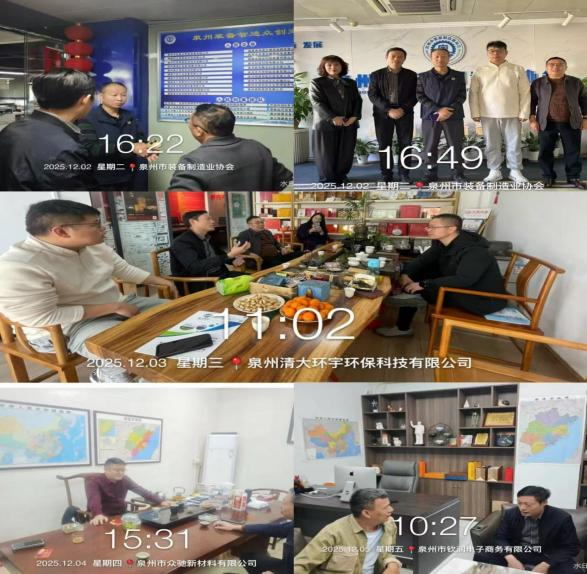12月2-5日,海西招商隊拜訪泉州市裝備制造業協會副會長夏文水、張德東、泉州清大環宇環保科技有限公司 副總經理藍馨,中國工業報副主任張躍良、泉州市眾馳新材料有限公司 董事長譚曉常、泉州市欽潤電子商務有限公司董事長周秋平就裝備制造、電子信息、城市環保項目以及招商線索等方面進行溝通交流。